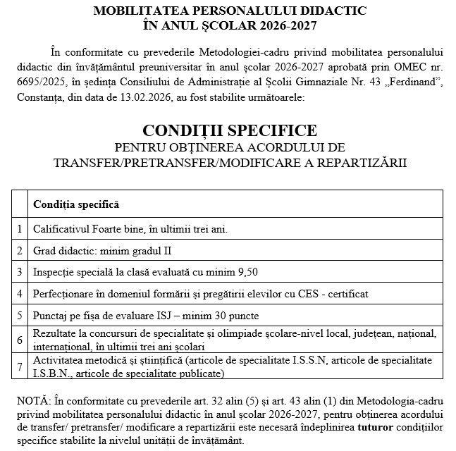În Școala Gimnazială nr. 43 „Ferdinand”, elevii beneficiază de un mediu sigur, favorabil învățării și dezvoltării atât din punct de vedere al performanței școlare, cât și pentru dobândirea de competențe sociale, atât de importante pentru reușita în viață de adult.