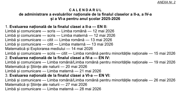 Evaluări naționale la finalul claselor a II-a, a IV-a și a VI-a